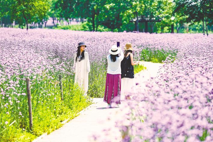 5月14日,武汉市东西湖区径河公园,超8万平方米的柳叶马鞭草进入盛花期,迎来最佳观赏期,众多游客穿行于紫色花海之中,拍照打卡。