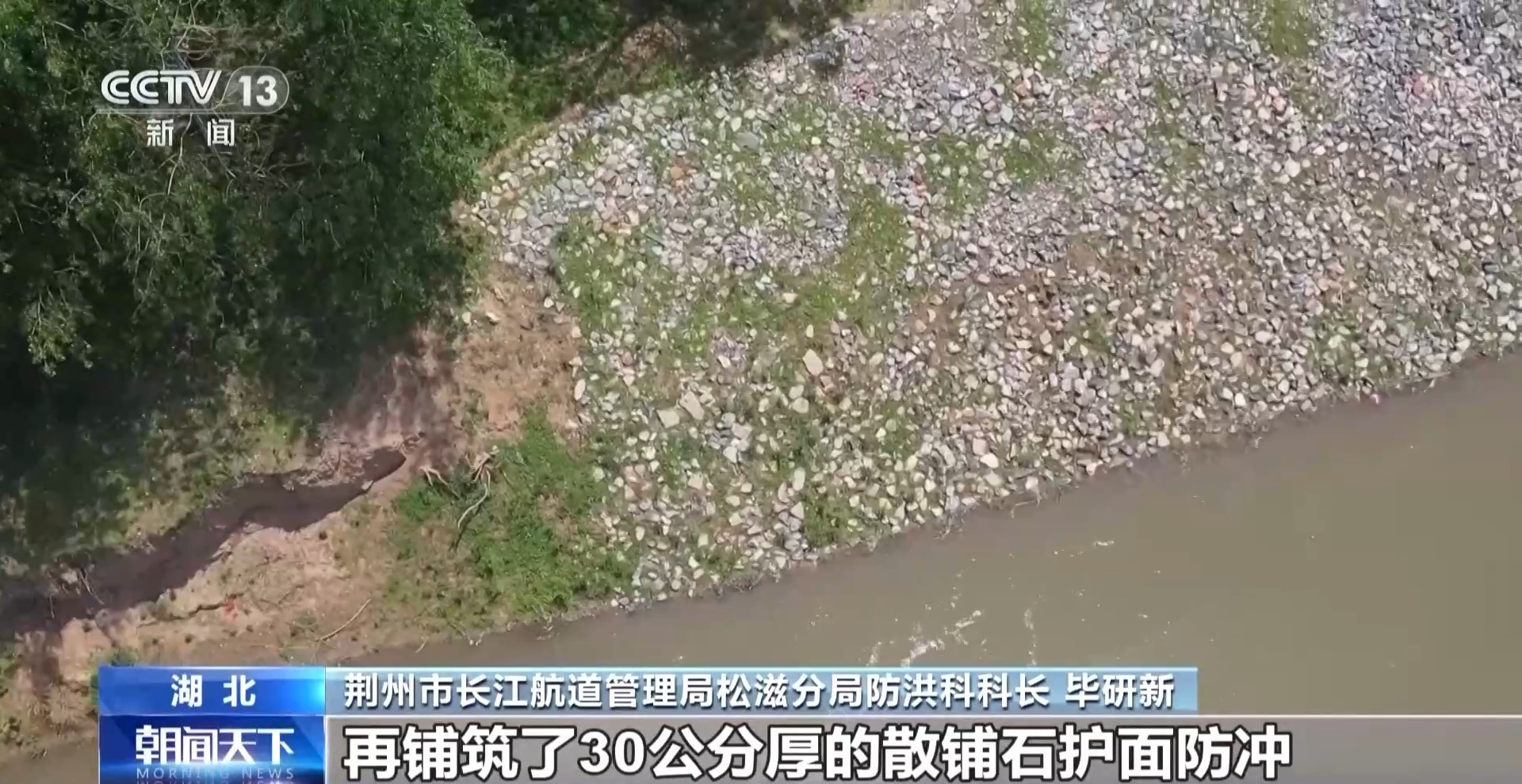 荆州市长江航道管理局松滋分局防洪科科长 毕研新:水下进行了抛石固脚,水上进行了坡面的削坡、减载,再铺筑了30厘米厚的散铺石护面防冲,离堤脚最近的这段距离,得到有效保护。