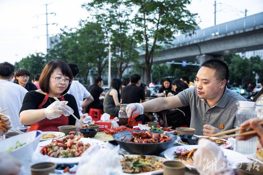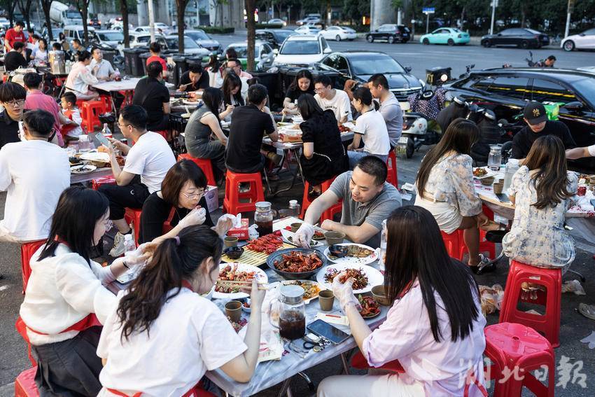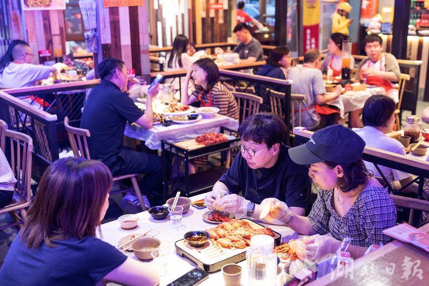 5月14日晚,在武汉市后湖一小龙虾店内,大堂内座无虚席,食客们品尝着各种口味的小龙虾,享受着属于夏日的味觉盛宴。立夏后,小龙虾再次成为武汉大排档、餐馆的主角,小龙虾“夜经济”正在激发城市消费新活力。