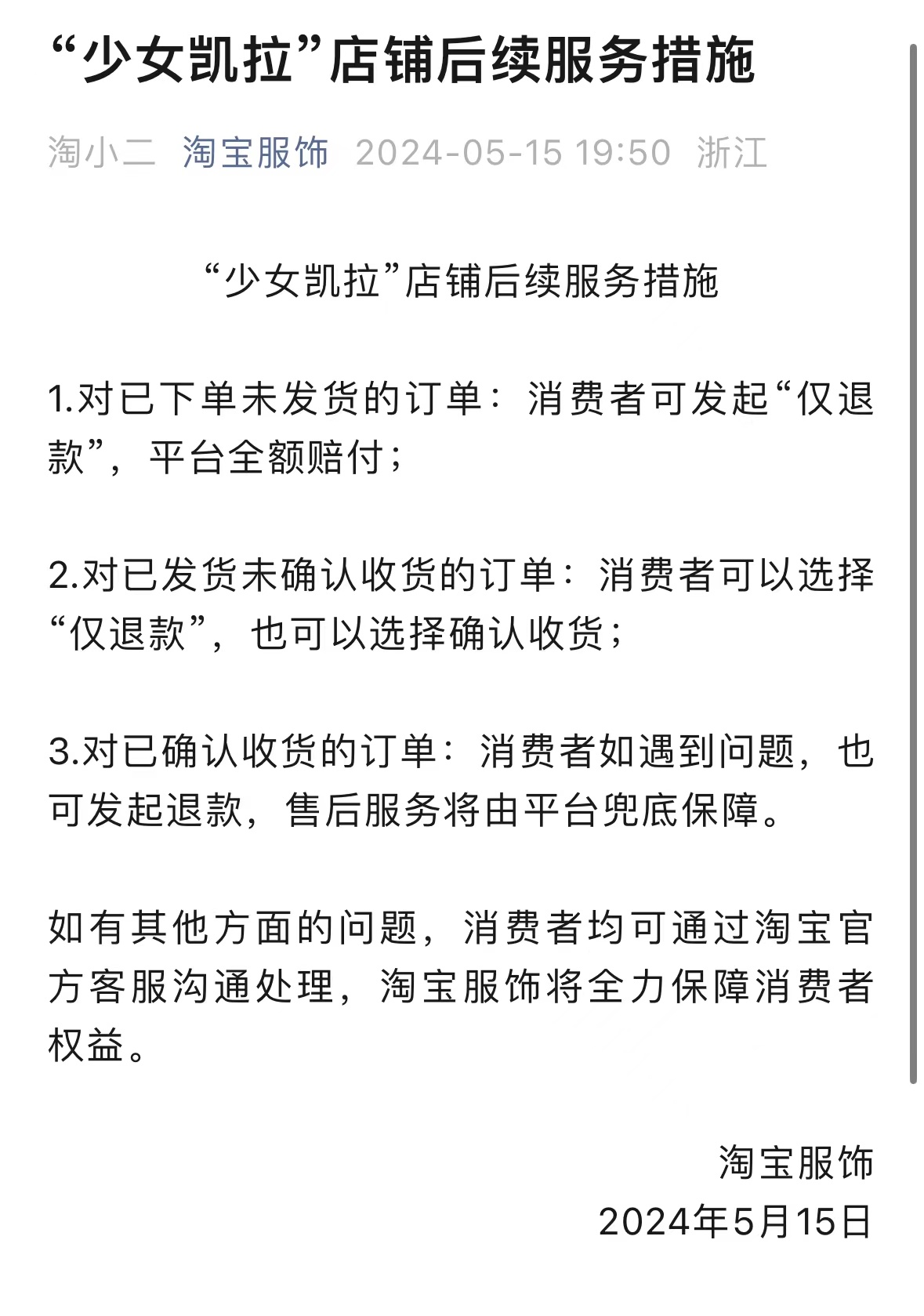 网红店铺“少女凯拉”突然关店,相关订单能否继续发货、已发货订单后续服务能否保障?淘宝服饰第一时间发布后续服务措施,表示兜底赔付和服务,全力保障消费者利益。