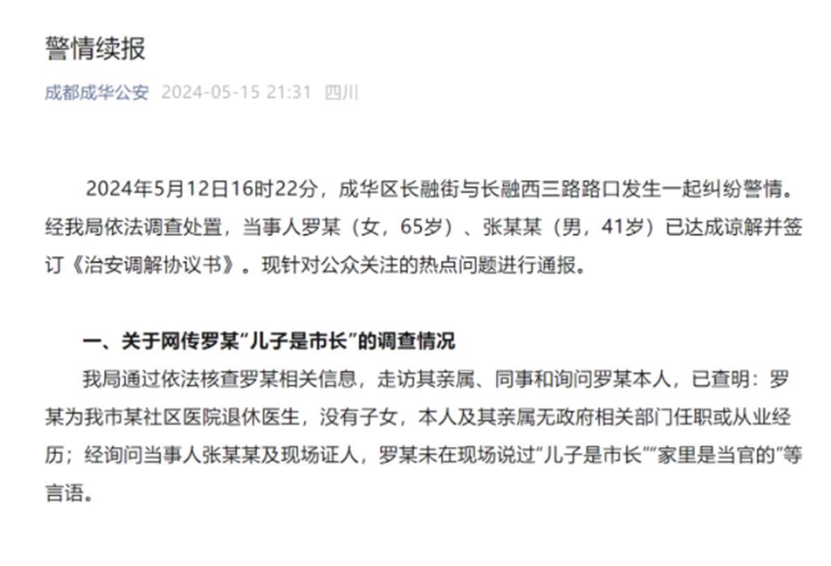 5月15日,成都成华公安发布警情续报:2024年5月12日16时22分,成华区长融街与长融西三路路口发生一起纠纷警情。经我局依法调查处置,当事人罗某(女,65岁)、张某某(男,41岁)已达成谅解并签订《治安调解协议书》。现针对公众关注的热点问题进行通报。(据5月15日界面新闻报道)