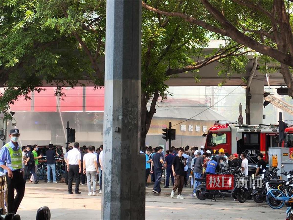 服装批发城外已不见明火,但仍有大量浓烟弥漫,现场有刺鼻的烧焦气味。消防人员和多台消防车正在向服装批发城外立面喷射水柱,对火场进行清理。
