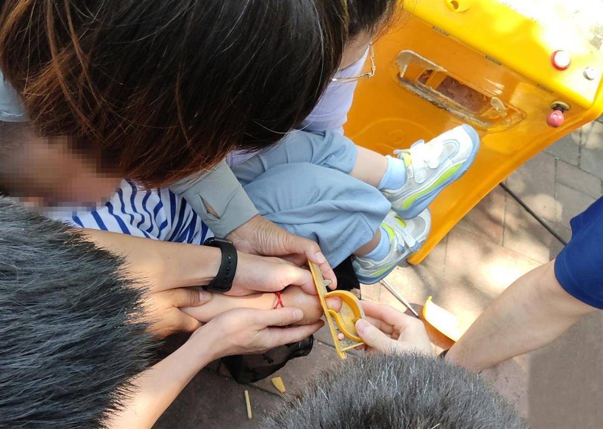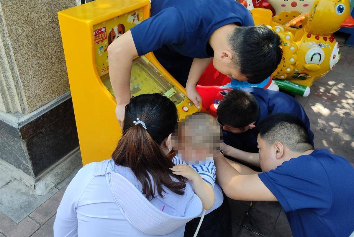 5月17日10时03分,武汉市洪山区张家湾街道某小区外,一名2岁幼童的右手食指,不慎被卡进放置在商铺门前的游戏机弹珠槽内。接到报警后,武汉市消防救援指挥中心立即调派青菱路消防救援站赶赴现场处置。消防员在到达现场后,发现幼童正站在一台投币式游戏机旁,幼童的右手食指被卡在游戏机投币口旁边的圆形弹珠槽内。为尽快使幼童手指脱困,在与商家沟通协商后,消防员决定先使用工具将游戏机弹珠槽从主机上撬出,待整个弹珠槽部件从主机上取下后,再使用剪刀钳对弹珠槽边缘进行剪切。最终,该幼童成功脱困。由于救援及时,幼童手指并无大碍。