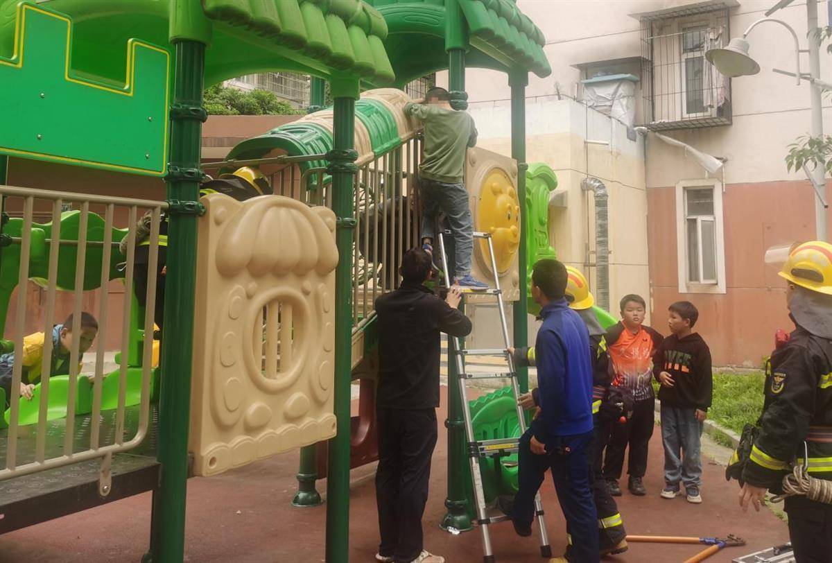 5月2日13时许,洪山区和平街道某小区内,一名8岁男童在玩耍时,不慎将左腿卡在儿童游乐设施的栏杆之间,无法拔出。接到报警后,武汉市消防救援指挥中心立即调派杨春湖消防救援站赶赴现场处置。消防员到达现场后,发现男童的右脚正踩在栏杆边缘处,左腿膝盖被紧紧卡在儿童游乐设施楼梯旁的两根栏杆之间。消防员立即架好救援升降梯,将男童右脚转移到梯子上站稳,随后,使用液压扩张器对栏杆进行轻微扩张。待救援空间扩大后,男童顺利脱困。