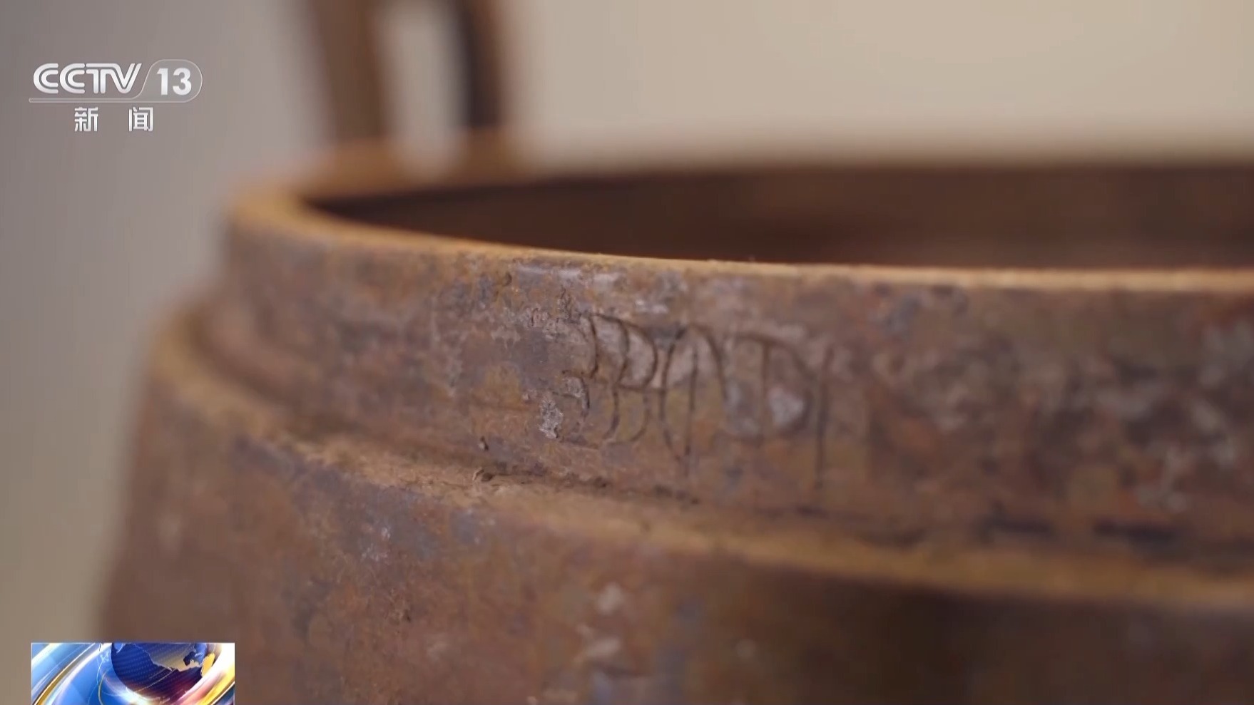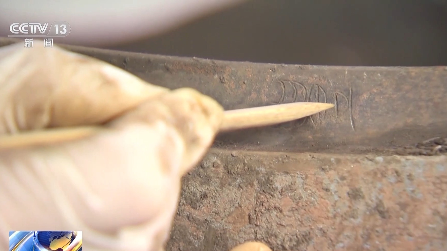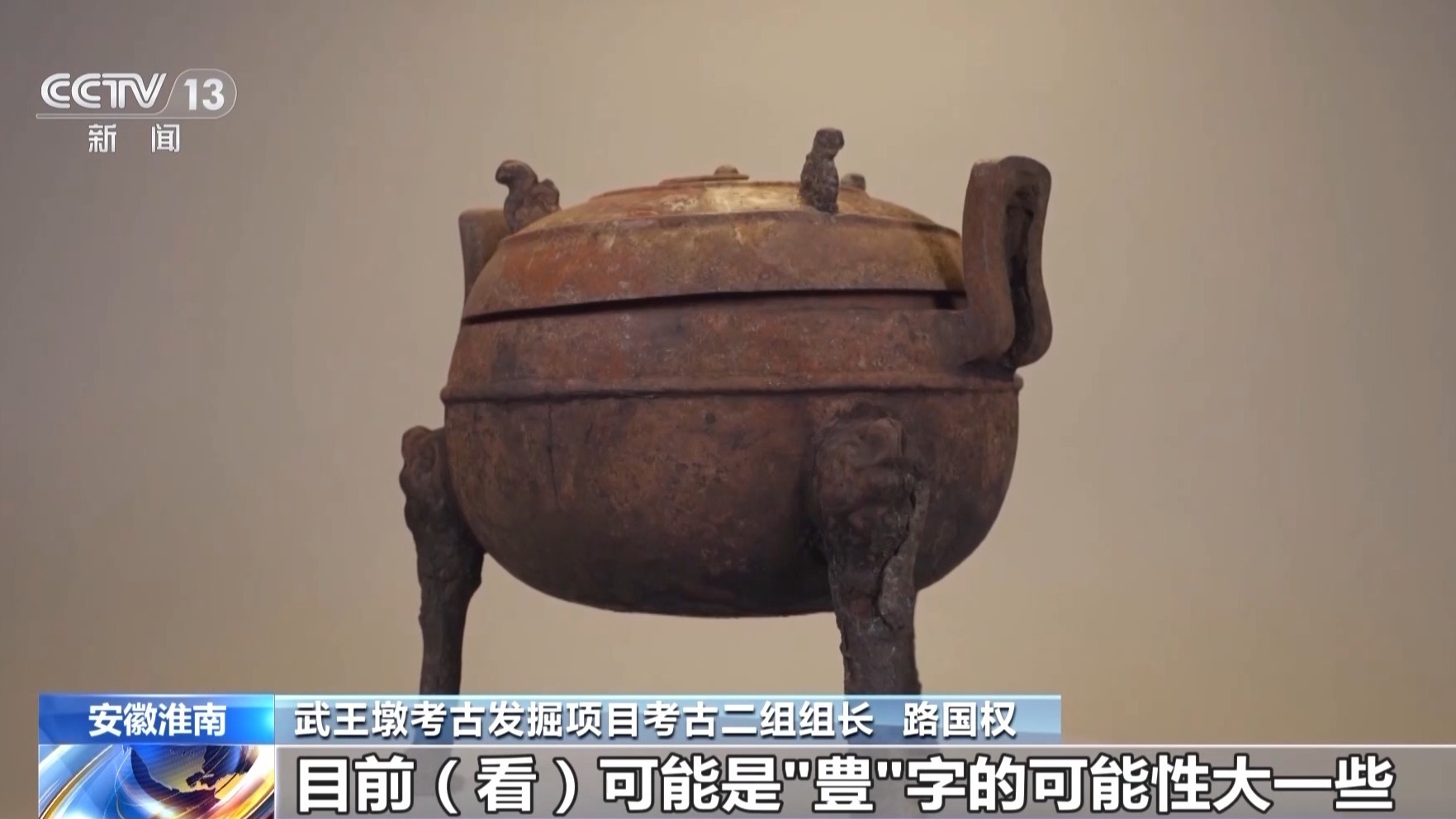 武王墩考古发掘项目考古二组组长 路国权:之前提取出来的一个铜鼎口沿部分,我们发现了有一个字,有一个铭文,目前看可能是“豊”字的可能性大一些。
