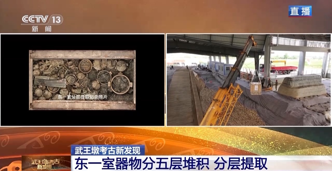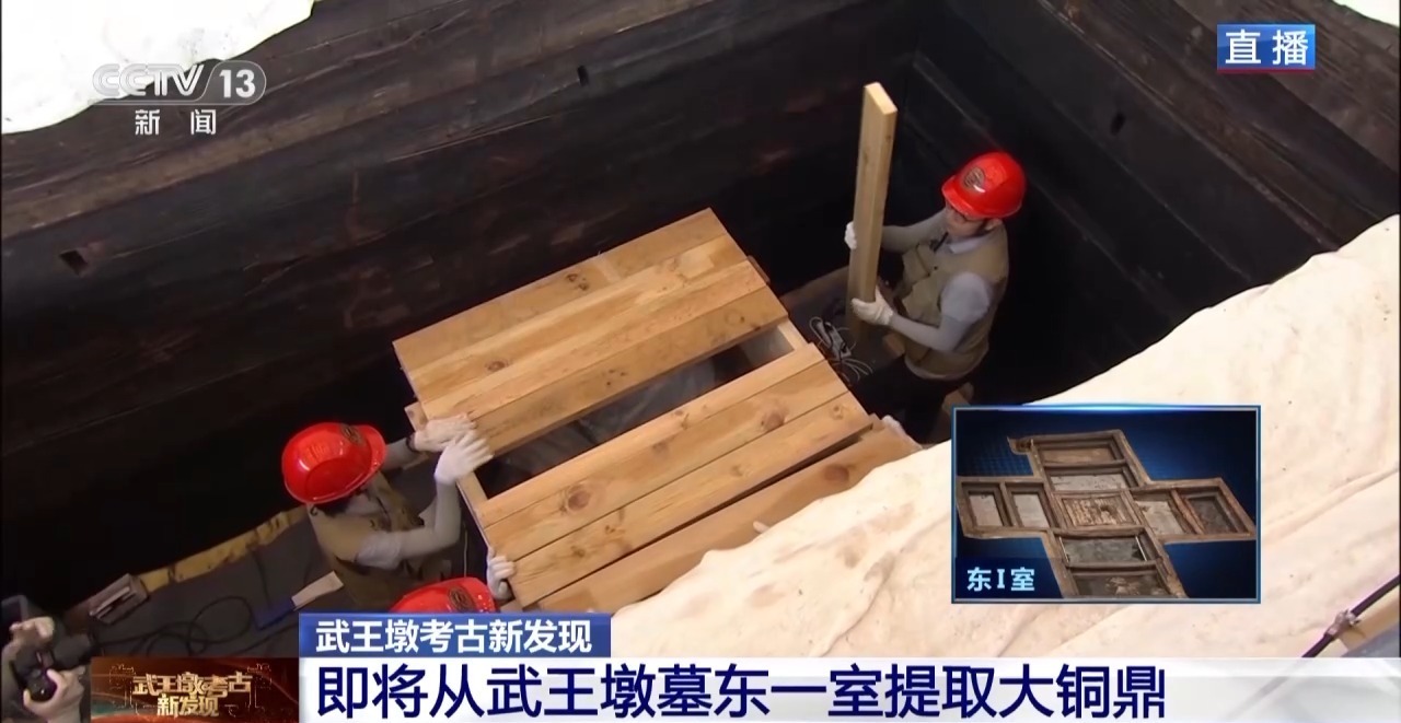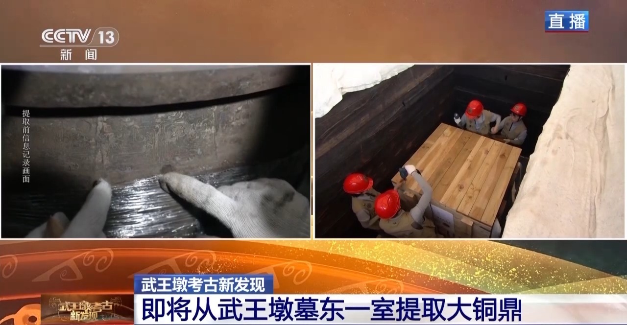 今天,国家文物局再次发布武王墩发掘成果,目前,武王墩墓北、西四个侧室已发掘完毕,考古人员刚刚从东一室提取出了大铜鼎,一起来看↓↓