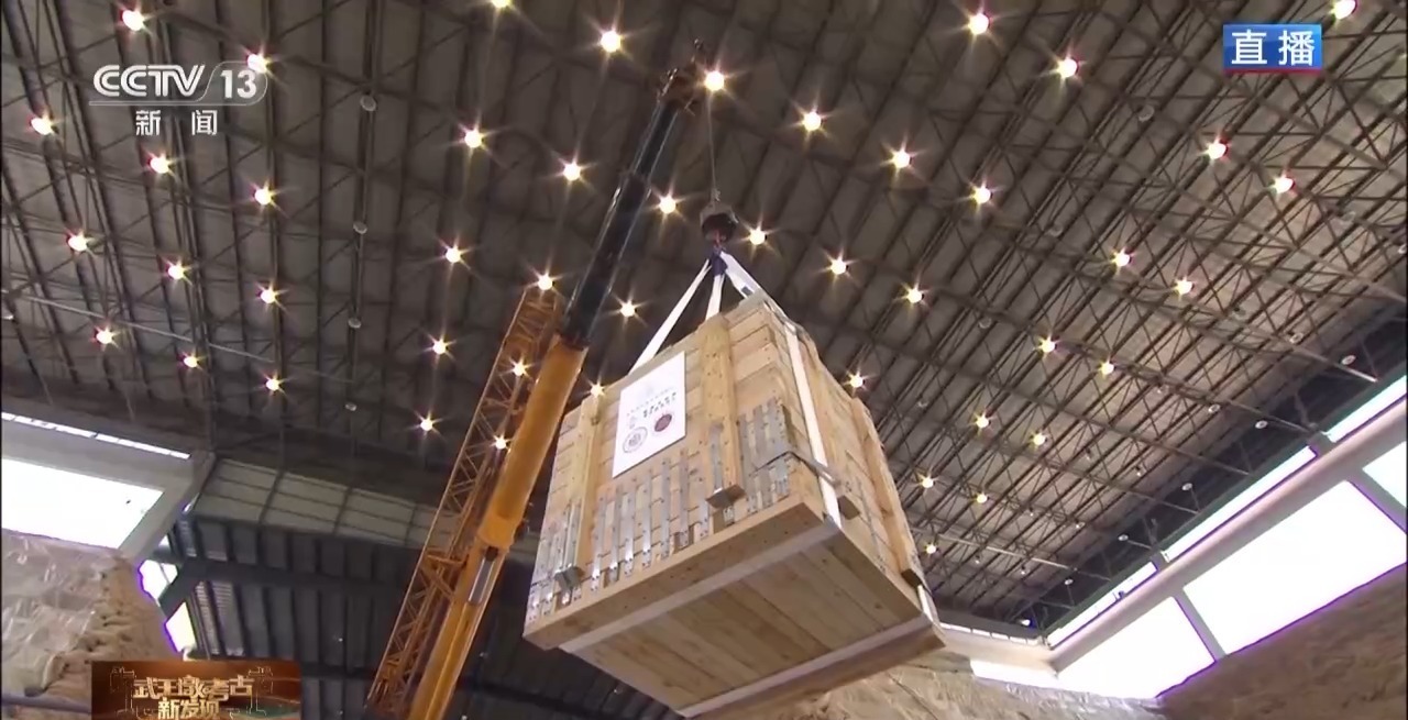 考古人员把铜鼎装入了套箱,在装入套箱之前,对大鼎做过一次起吊,是将其吊到套箱的底板上。 由于两个鼎腿有裂缝,在起吊之前,用高分子绷带对鼎腿进行了加固;对鼎腹贴敷水凝胶和环氧碳纤维布,减轻吊带对鼎腹的磨损和压力;在鼎腹下放置井字形支架,缓解鼎身对鼎足的压力。 之后,再上侧板,并用珍珠棉、聚氨酯等缓冲材料充填大鼎和套箱之间的空隙,直至没过大鼎的鼎腿,保证大鼎的稳定性。最后,再封箱和吊运。