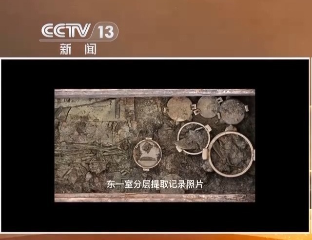 东一室器物分为五层堆积,考古人员对其进行了分层提取,每层都会做三维建模。东一室共编号提取各类器物700余件/组,其中铜器154件/组、漆木竹器77件/组、石器23件、草席5卷,植物包若干,其余为置物架等木构件。置物架案板有两类,据此推测东一室至少有两堵器物架、上下四层案板、器物分五层堆积。