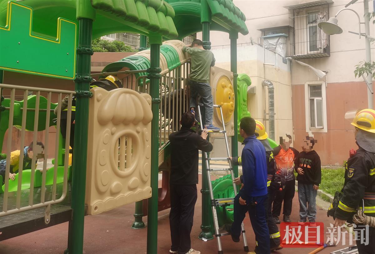 5月2日13时许,在洪山区和平街道某小区内,一名8岁男童在玩耍时,不慎将左腿卡在儿童游乐设施的栏杆之间。武汉市消防救援指挥中心立即调派杨春湖消防救援站赶赴现场处置。消防员到达现场后,发现男童的右脚踩在栏杆边缘处,左腿膝盖被紧紧卡在两根栏杆之间。消防员立即架好救援升降梯,将男童右脚转移到梯子上站稳,随后使用液压扩张器对栏杆进行轻微扩张。待救援空间扩大后,男童顺利脱困。