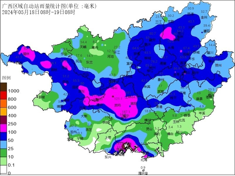据统计,5月18日8时至19日8时,广西钦州、防城港、南宁等3个市的4个县(市、区)的8个乡镇有特大暴雨,11个市的32个县(市、区)的114个乡镇有大暴雨,14个市的76个县(市、区)的397个乡镇有暴雨,14个市的77个县(市、区)的331个乡镇有大雨。今天白天到晚上强降雨持续,梧州、玉林、来宾、贵港、南宁、北海、钦州、防城港、崇左等市有暴雨、局地大暴雨到特大暴雨并伴有短时雷暴大风等强对流天气,其它地区有中到大雨、局地暴雨。20日白天降雨明显减弱,广西全区多云有分散阵雨或雷雨。21-22日,全区多云,其中桂东有分散阵雨。