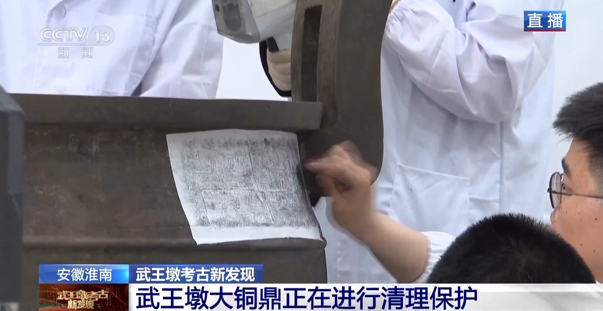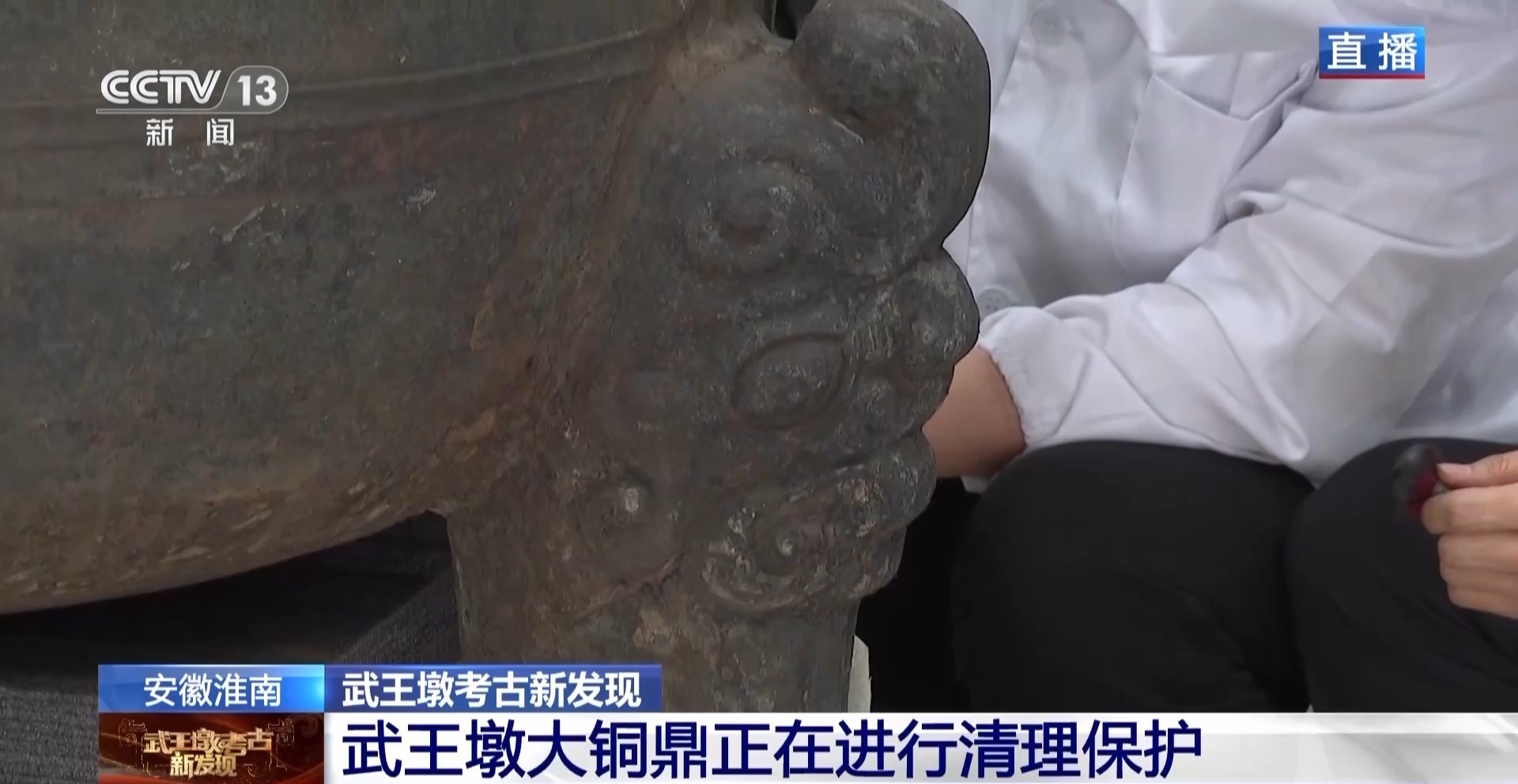 国家文物局再次发布武王墩发掘成果。目前,武王墩墓北、西四个侧室已发掘完毕,昨日(18日),考古人员从一号墓东一室提取出武王墩大铜鼎之后,就转运到了距离发掘现场300米的考古实验室。经过一天的清理和保护之后,目前它是什么状态?又显露出了哪些重要信息呢?