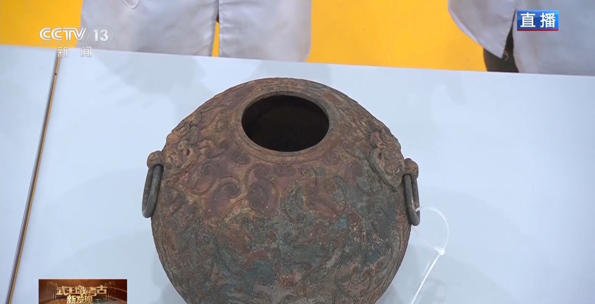 首次发现的这件铺首衔环球形三足瓮,目前归为盥洗器,但其功用暂不清楚。上面有精美的勾连云纹,立体感十足。
