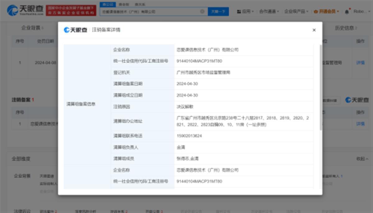 今年“3·15”晚会曝光恋爱课公司“把客户当成猎物”,收取高昂会员费。天眼查App显示,涉事公司恋爱课信息技术(广州)有限公司成立于2023年7月,注册资本100万人民币,由张得志、金清共同持股。行政处罚信息显示,该公司以虚假及引人误解的方式对提供的服务内容作宣传,被罚款56.2万元、没收违法所得3.4万余元。近日,该公司新增注销备案信息,注销原因为“决议解散”。此外,该公司近日因通过登记的住所或者经营场所无法联系,已被广州市越秀区市场监督管理局列入经营异常名录。