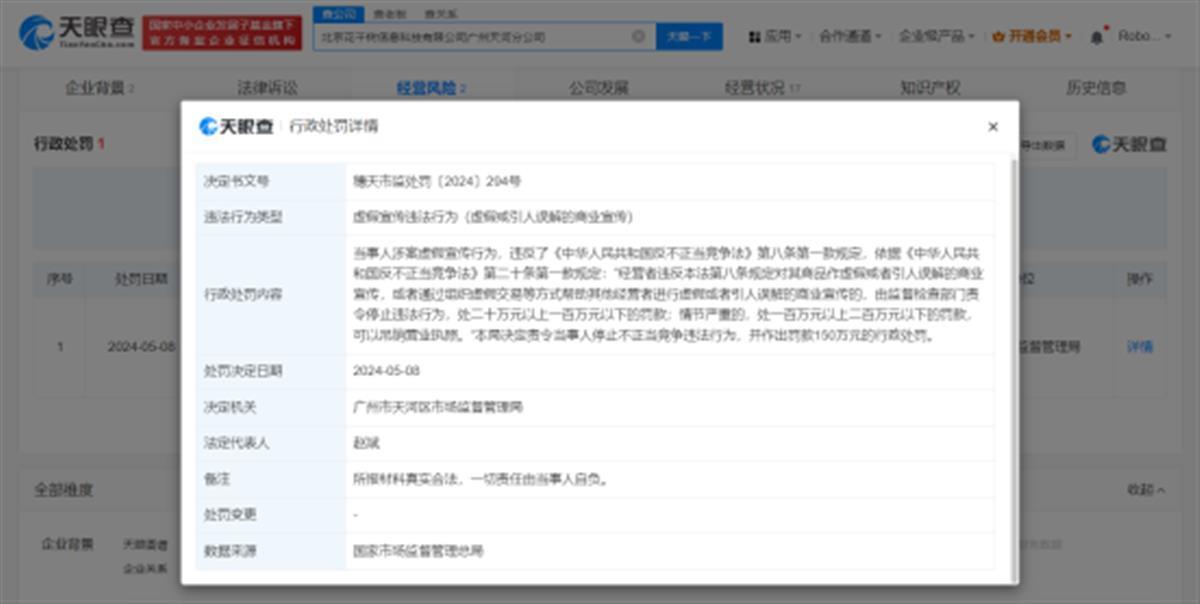 值得一提的是,通过“天眼查”平台查询发现,珍爱网涉及多起法律诉讼,案由包括劳动争议、委托合同纠纷、肖像权纠纷等。此外,天眼查经营风险信息显示,深圳市珍爱网信息技术有限公司、世纪佳缘旗下北京花千树信息科技有限公司广州天河分公司都曾因对其商品作虚假或者引人误解的商业宣传,违反了反不正当竞争法,被监管部门处以百万元的罚款。