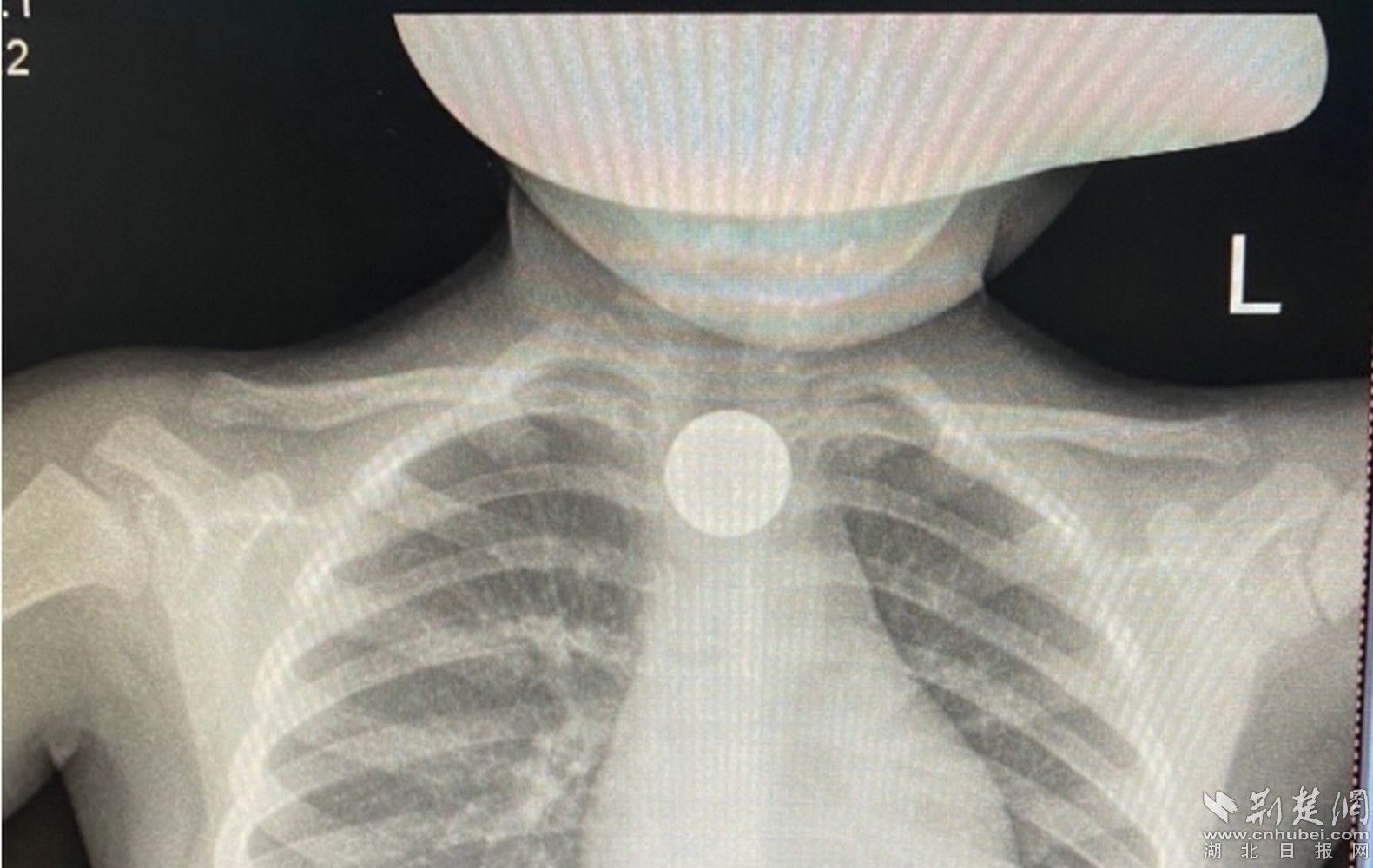 据患儿家长介绍,孩子玩耍时,不慎将一枚硬币吞食。因硬币卡住喉咙,孩子一直咳嗽,家长了解情况后立即带患儿来到孝感市中心医院消化内科就诊。经胸部CT检查,发现食管胸段见直径约2.4cm类圆形异物,若不及时取出,容易造成食道穿孔、破裂,继发感染,情况严重可危及生命。