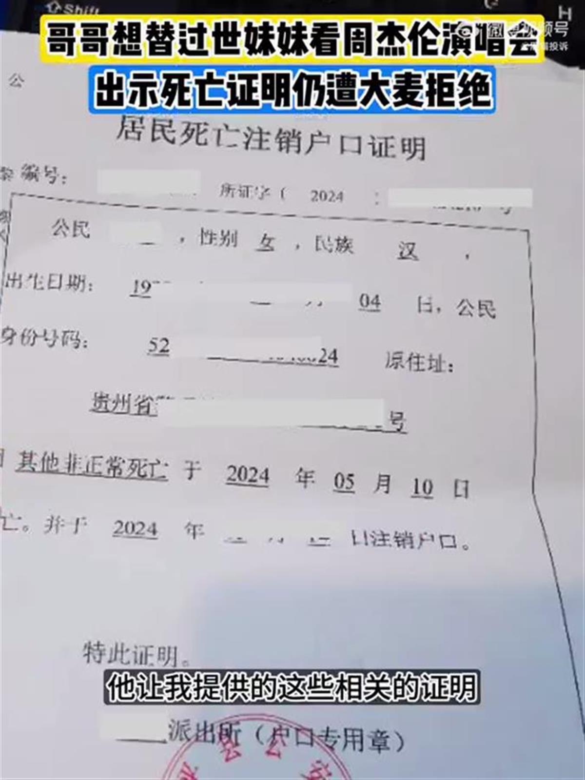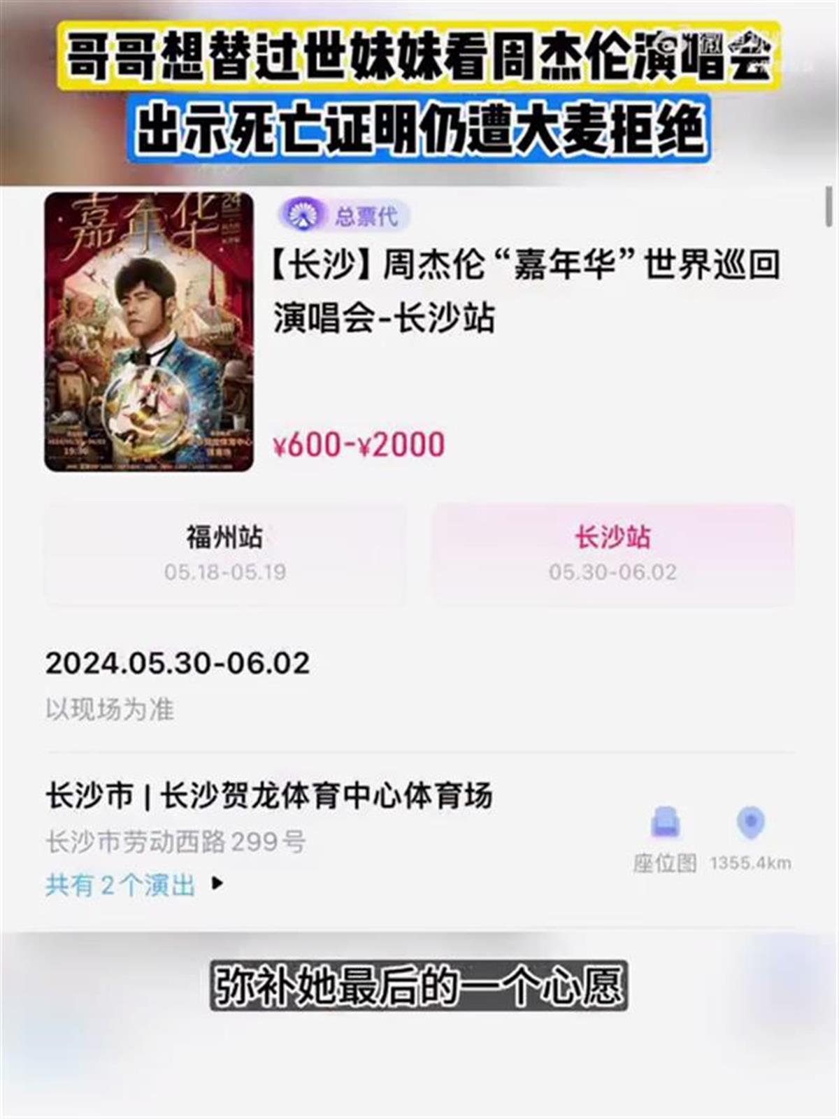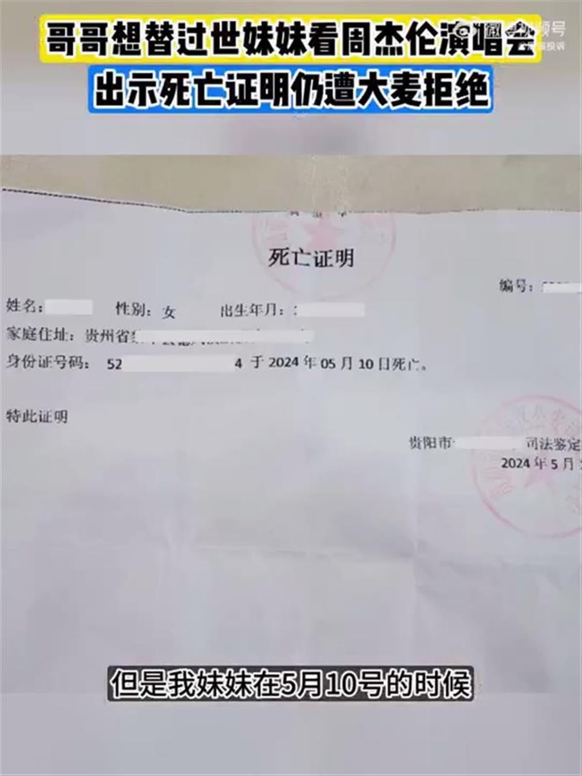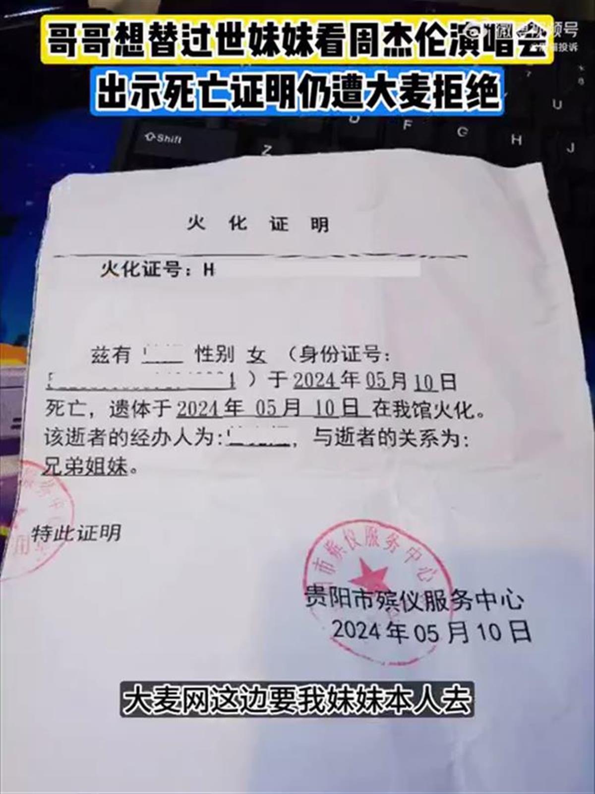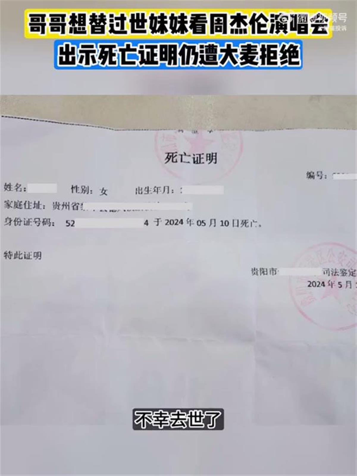 5月21日,王先生(化名)向“黑猫投诉”平台投诉称,自己的妹妹买了6月1日周杰伦长沙演唱会门票,然而不幸的是,妹妹在本月初因意外去世。见周杰伦是妹妹一直以来的愿望,王先生希望能替妹妹完成,于是从5月14日起向票务平台大麦申请更换观演人。但在他按要求出示了死亡证明、销户证明后,却仍被大麦拒绝,要求妹妹本人前往。(据5月21日红星新闻)