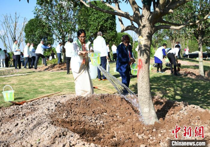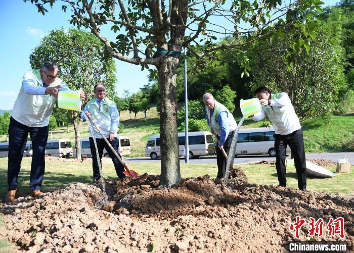 图为外宾为种下的桂花树浇水。中新网记者 周毅 摄