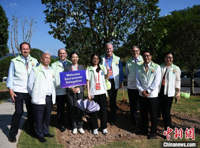 图为外籍嘉宾在种下的桂花树前与中方工作人员合影留念。中新网记者 周毅 摄