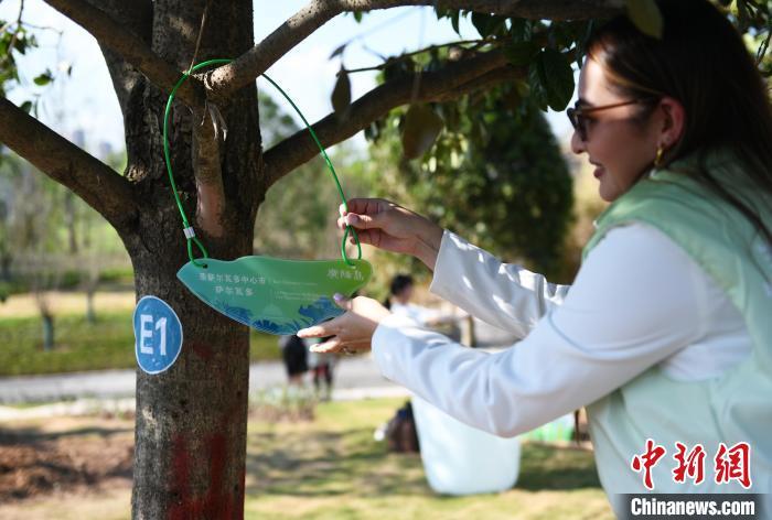图为外籍嘉宾在重庆广阳岛种下象征友谊的桂花树,并悬挂树牌。中新网记者 周毅 摄