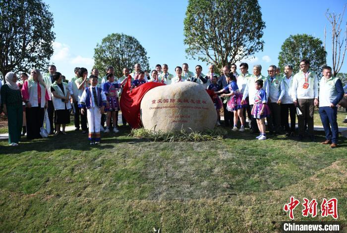 图为活动现场,中外嘉宾见证重庆国际友城友谊林揭幕。中新网记者 周毅 摄