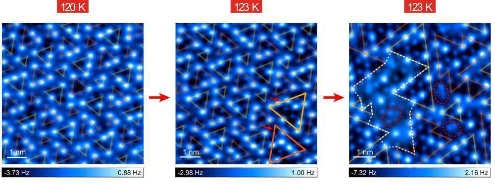 图为随着温度升高冰表面预融化过程的原子级分辨成像。(受访者供图)