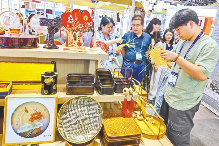 巧手飞舞,一件件非遗竹编作品现场完成,观者无不赞叹。来自湖北科技学院“布谷鸟”非遗文创团队的李荟荟、李林涛等人,在展会现场几乎没有停手,他们现场编制的作品引来游客抢购。“鄂南是全国著名竹乡,我们立足于此,致力于非遗竹编的传承发展,通过改良工艺、活化非遗技艺,助力乡村振兴。”李林涛介绍。