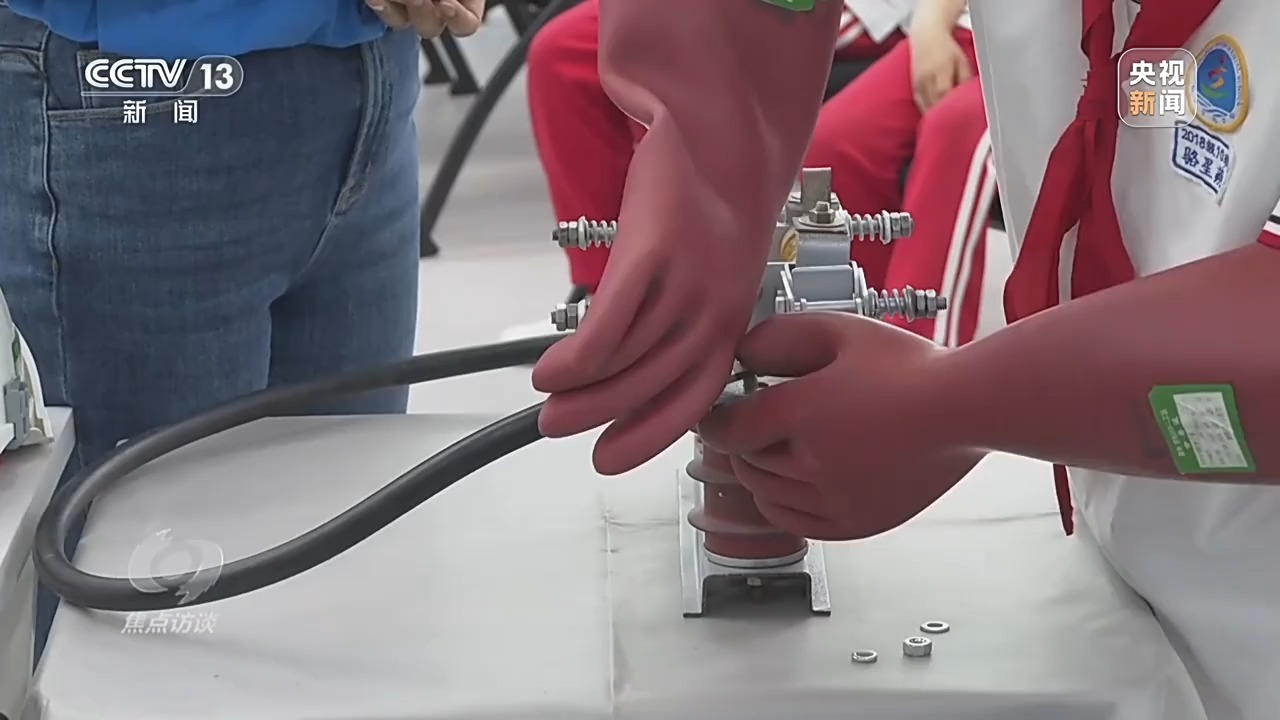 为了让学生有更切实的体会,老师选择了两位同学戴着绝缘手套去体验电力工人日常最简单的工作拧螺丝,试了几遍都没成功,而电力师傅一出手就拧上了。孩子们的眼睛里满是惊讶与好奇,等着师傅分享经验。
