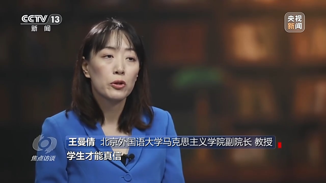 北京外国语大学马克思主义学院副院长 教授 王曼倩:思政课教师的政治强,情怀深,学生才能真信。思维新,视野广,学生才能真懂。思政课教师要引导学生在点滴的身边人、身边事当中去接受思政课背后的哲理道理。思政课教师他自立严、人格正,学生才能真用。学生被教师的人格和知识所感染,那么他就会自觉地把教师的教导转化为自己的实践行动。