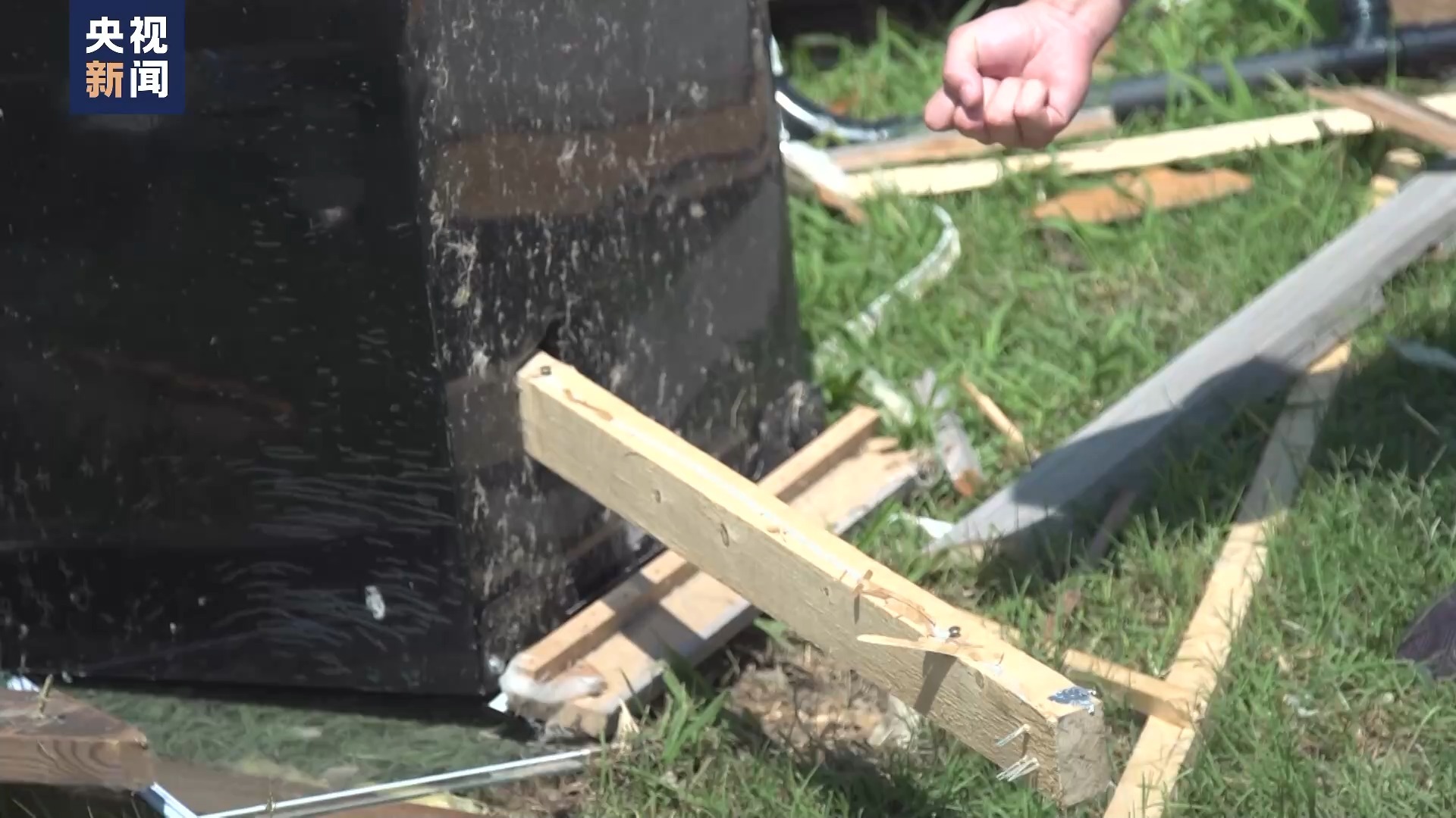 央视记者 刘旭:这场龙卷风带来的破坏力究竟有多大,我旁边就有个生动的例子。这里是一台全金属结构的冰箱,由于龙卷风巨大的破坏力,一根木头已经直接插进了金属冰箱里面。
