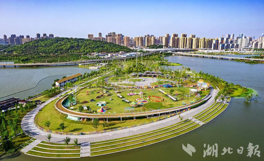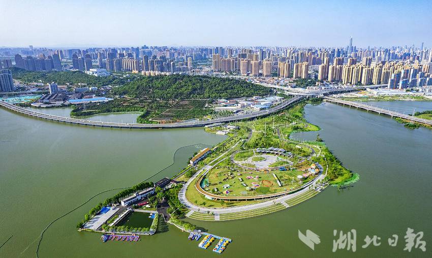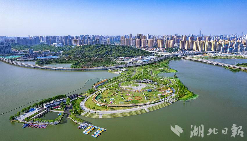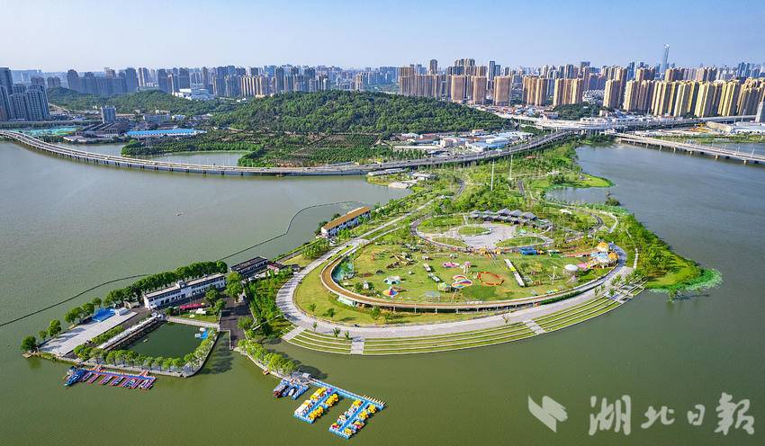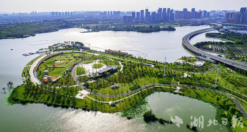 5月27日,鸟瞰美如画的武汉汉阳龙阳湖公园半岛园区,作为龙阳湖公园景观中心的半岛园区,已成为周边市民热门打卡地。站在半岛园区驿站二层的观景平台上,可280度观景,不远处的龙阳湖沿岸湖光水色尽收眼底。