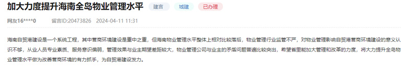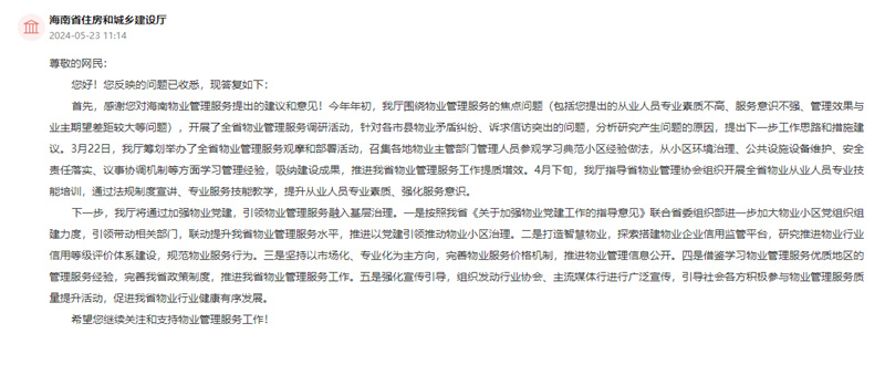收到留言后,海南省住房和城乡建设厅回复称,今年年初,围绕物业管理服务的焦点问题(包括群众提出的从业人员专业素质不高、服务意识不强、管理效果与业主期望差距较大等问题),海南省住房和城乡建设厅开展了全省物业管理服务调研活动,针对各市县物业矛盾纠纷、诉求信访突出的问题,分析研究产生问题的原因,提出下一步工作思路和措施建议。