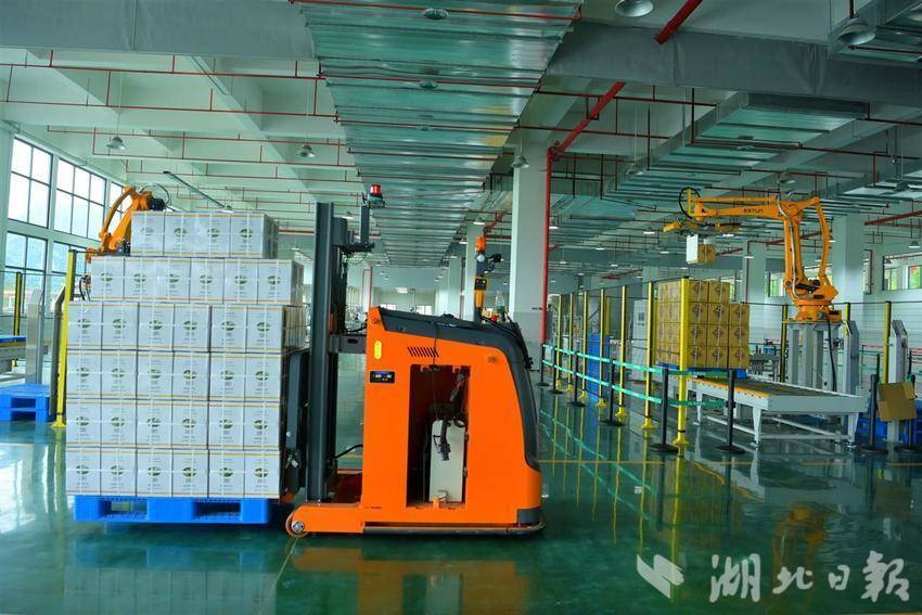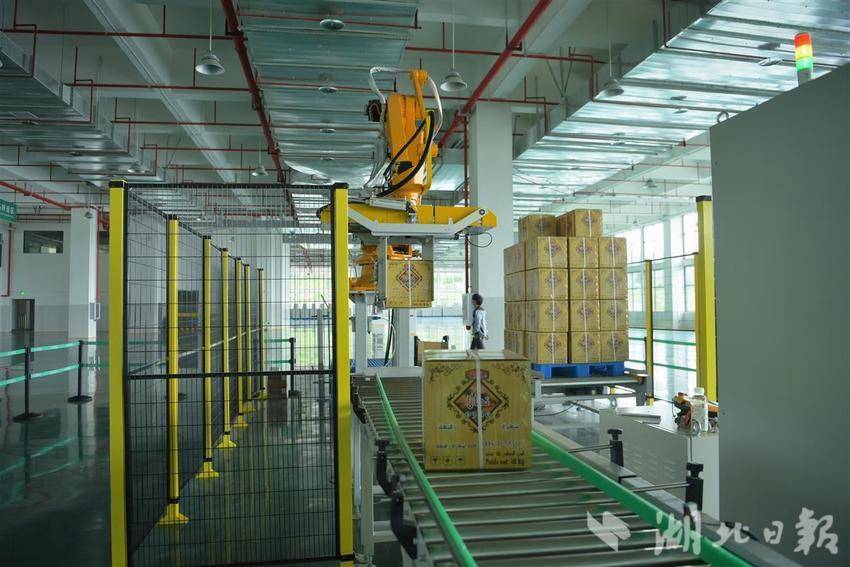 正是夏茶生产旺季,车间内一个高近3米的黄色“大家伙”正在卖力忙活。只见一个个装满茶叶的包裹沿着传送带上依次抵达送它面前,它的机械臂立刻抓取包裹,完成装箱、堆叠、缠膜处理,最后投进指订货框,一系列动作一气呵成,全程精准无误。