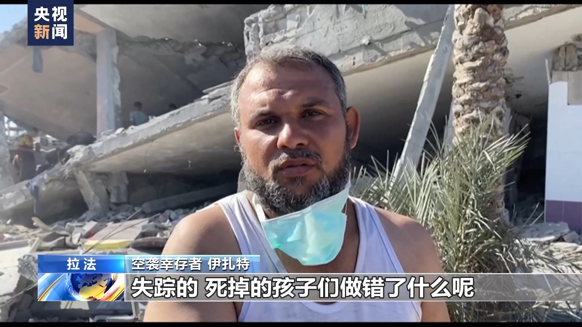 空袭幸存者 伊扎特:我们当时在这里坐着,突然这栋建筑就被击中了,以军说这里是“安全区”,然而不是这样的。失踪的、死掉的孩子们做错了什么呢?孩子们做错了什么呢?他们手里没有火箭弹。