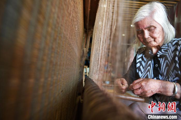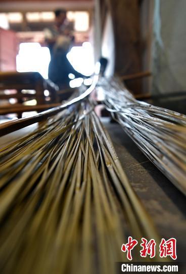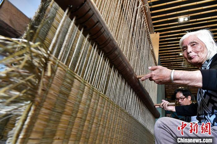 图为5月29日,福建三明永安市贡川镇贡席体验馆“永安贡席制作工艺”代表性传承人83岁的邓丽娣在编席机前制作草席。 中新网记者 张斌 摄