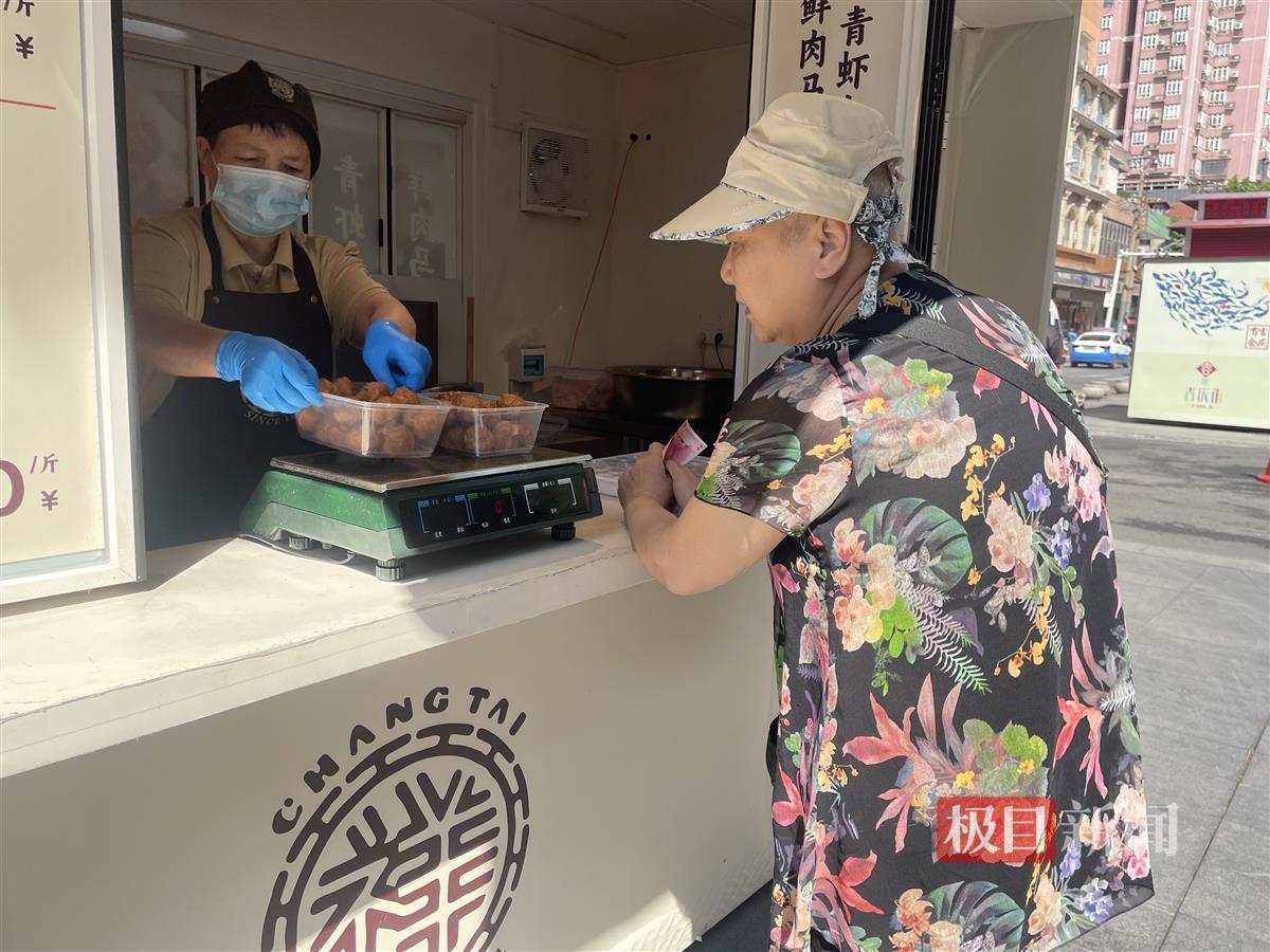 5月29日,极目新闻记者在曹祥泰吉庆街店外看到,除了传统糕点,店外的熟食档口还售卖炸肉丸和猪排等,家住吉庆街附近的张婆婆购买了117元的炸肉丸,“曹祥泰的炸肉丸用青虾代替了鱼肉,还加入了马蹄。肉质更扎实,口感更清爽。”张婆婆说,每年端午节都会吃曹祥泰的绿豆糕,如今的炸肉丸用料同样扎实,也成为她回购率较高的单品。