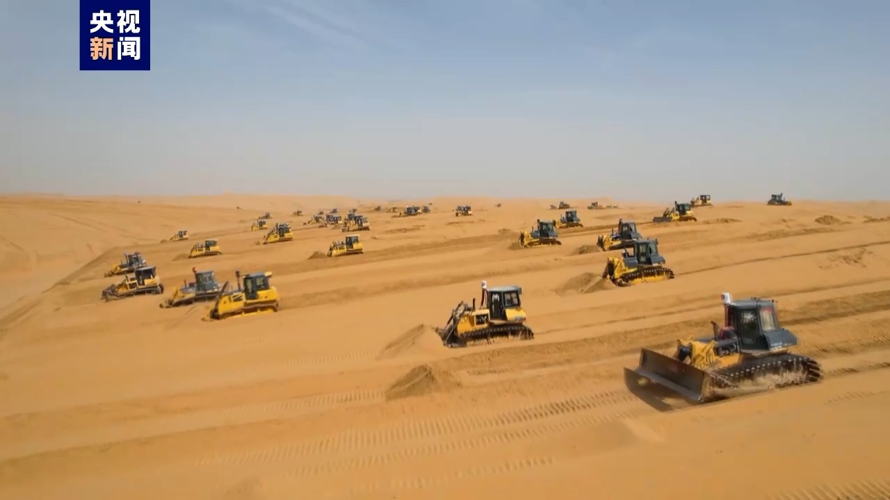 沙漠地势起伏不定,需要靠推土机将高低不平的沙漠平整为平地。在这个基地,几百台推土机需要好几个月才能摆平10万亩沙地,地平整了,一片片光伏板就好铺了!