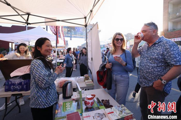 当地时间5月31日,为期3天的2024年渥太华唐人街大夜市在加拿大首都渥太华揭幕。图为在中国驻加拿大使馆设置的文化展示摊位前,当地民众驻足品尝中国茶。中新社记者 余瑞冬 摄