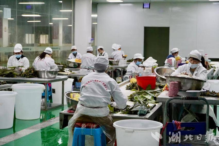 从包粽子、煮粽子,到冷却、杀菌、真空包装,每条流水线都有许多工人。楚杏堂(恩施州)食品有限公司负责人陈航说。
