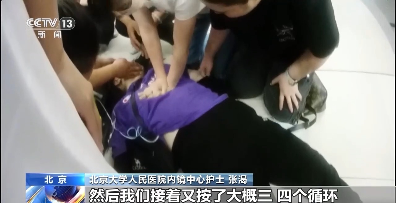 北京大学人民医院内镜中心护士 张渴:当时第一次吹人工呼吸的时候,感觉不是太能进气,但是吹第二个的时候,感觉她的呼吸上来了,慢慢有那种大喘气。我们接着又按了大概三四个循环,在这期间贴AED(电极片),除了2次颤。120来了之后,辅助做完血压血糖这些检查,她吸上氧气后,我又摸了一下她的颈动脉,搏动还是比较强的,恢复了。