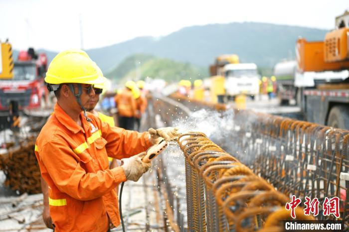 中新网南宁6月2日电(蒋雪林 梁孟信)6月2日,南湛高速广西段施工进入冲刺阶段,工人冒着40摄氏度的路面温度,在该高速公路目前唯一一个未完工的施工点——跨黎钦铁路立交桥上紧张施工,6月8日前将完成施工,有望6月18日交付使用。