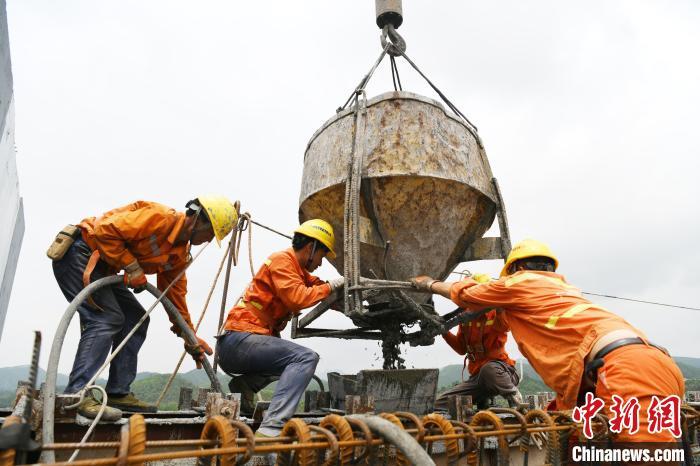 图为工人正在进行护栏浇筑作业。 记者 蒋雪林 摄