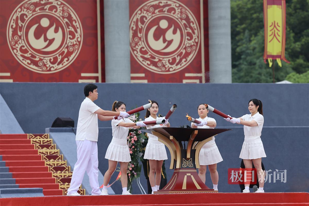 9项仪程依次进行,每一项都透着仪式感和不同的情愫。当起鼓鸣钟时,咸和之曲奏响,所有人肃然起敬。当圣门徐徐开启,炎帝神农圣像显现在海内外炎黄子孙面前时,有人眼含热泪。当来自中国大陆、香港、澳门、台湾和海外华侨青年学子代表共同点燃新火的那一刻,两只丹雀冲向天际,在场人的目光随着丹雀望向天空,看向青年的眼神写着赞许和期望……