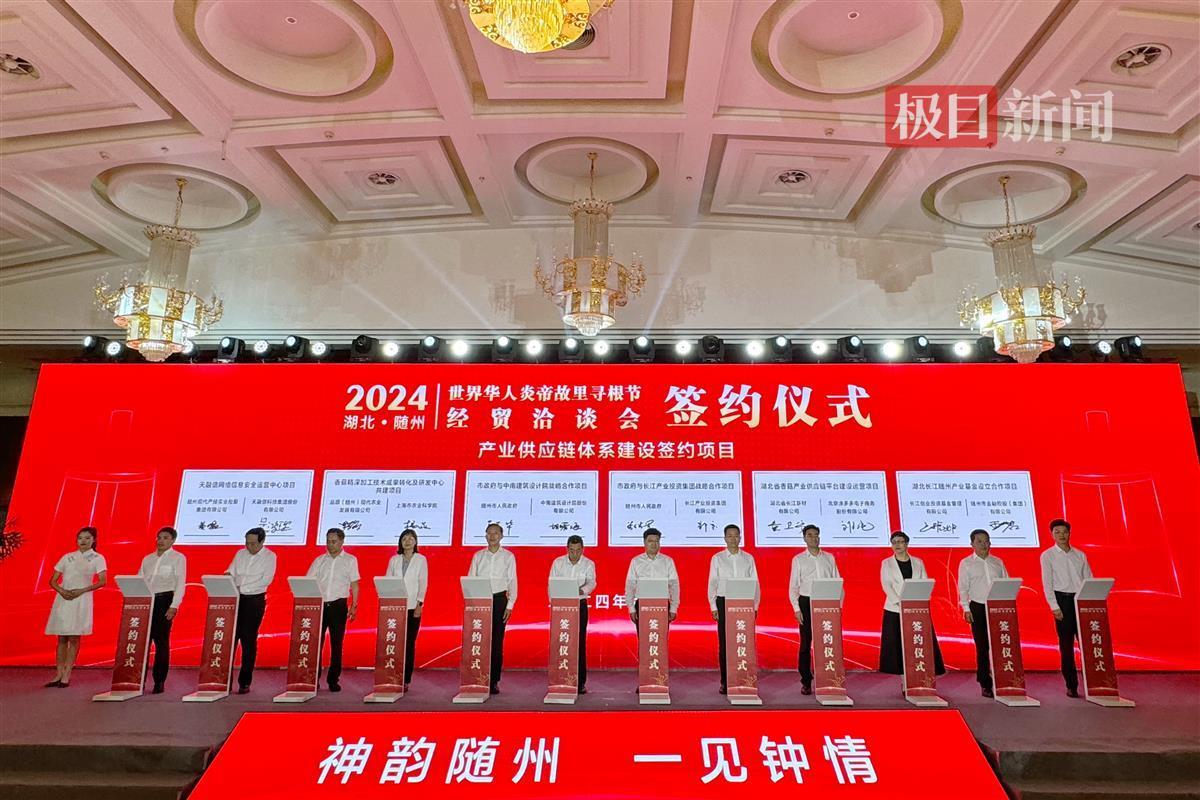6月1日,世界华人炎帝故里寻根节经贸洽谈会上,24个项目成功签约,涉及随州市主导产业链供应链体系建设、新能源、汽车、高端装备、新材料、大数据等产业,总投资额287.5亿元。
