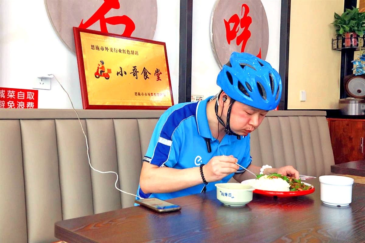 楚天都市报极目新闻讯(记者李博 通讯员廖珏瑶)5月29日,在送完午间用餐高峰期的最后一笔订单后,外卖骑手严威长舒一口气,大步走进位于恩施六角亭街道花语城钱汤圆的“小哥食堂”用餐。此前,恩施市钱汤圆花语城店、老周夜市红旗大桥店等22家“小哥食堂”已陆续挂牌。