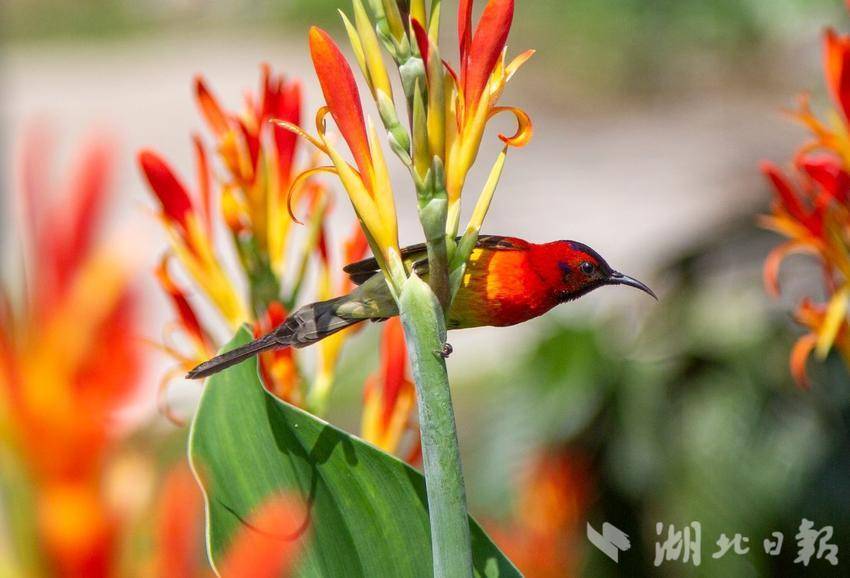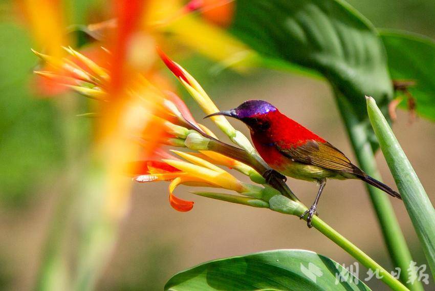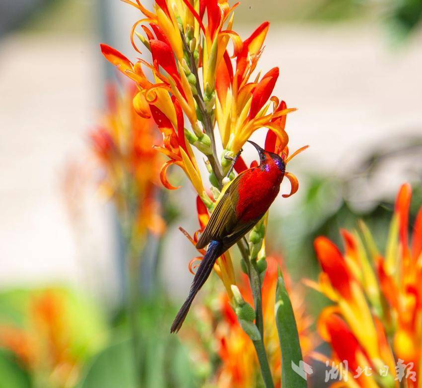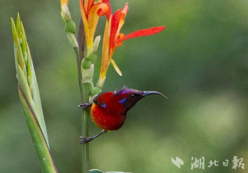 湖北日报客户端讯(通讯员陈功龙)6月2日,摄影师在巴东县东瀼口镇西陵村陈家湾,拍到美丽的雄性蓝喉太阳鸟正在花朵上觅食、嬉戏。