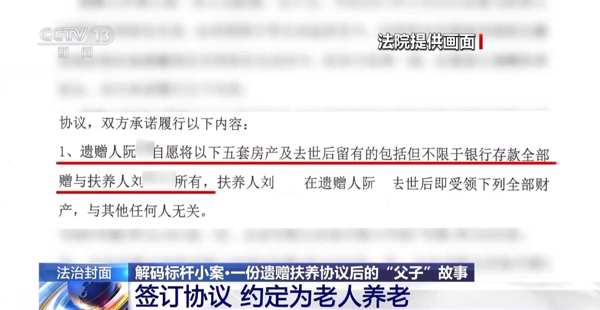 视频画面中是去年3月31日,刘先生与阮老先生在律师的见证下,第二次签订遗赠扶养协议的现场。画面中的这位老人就是阮先生,签这份协议的时候他已经93岁了。左边的就是刘先生。协议约定,由刘先生照顾阮先生并负责生养死葬,阮先生将其取得的五套回迁房等在内的全部财产遗赠给刘先生。