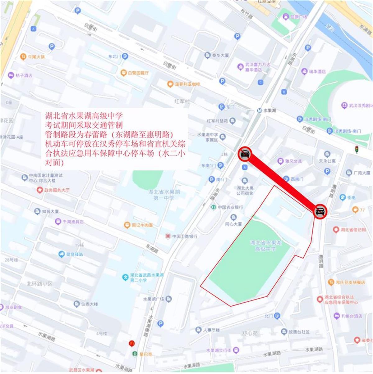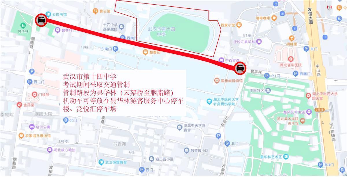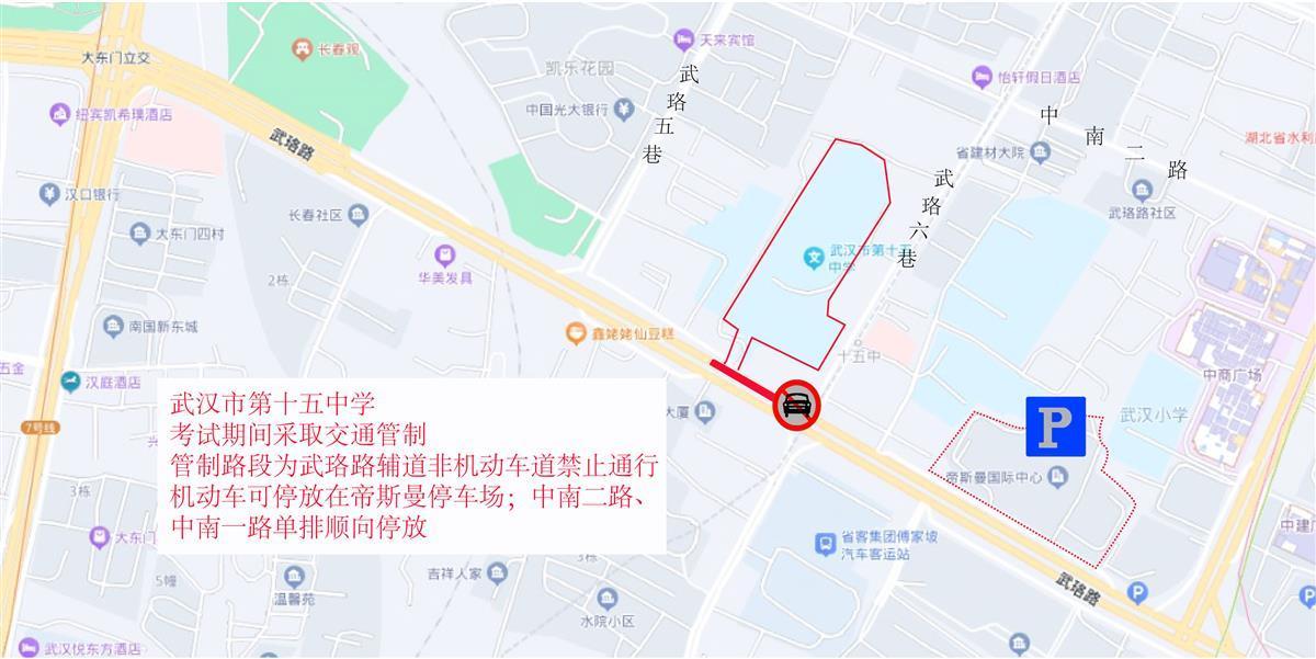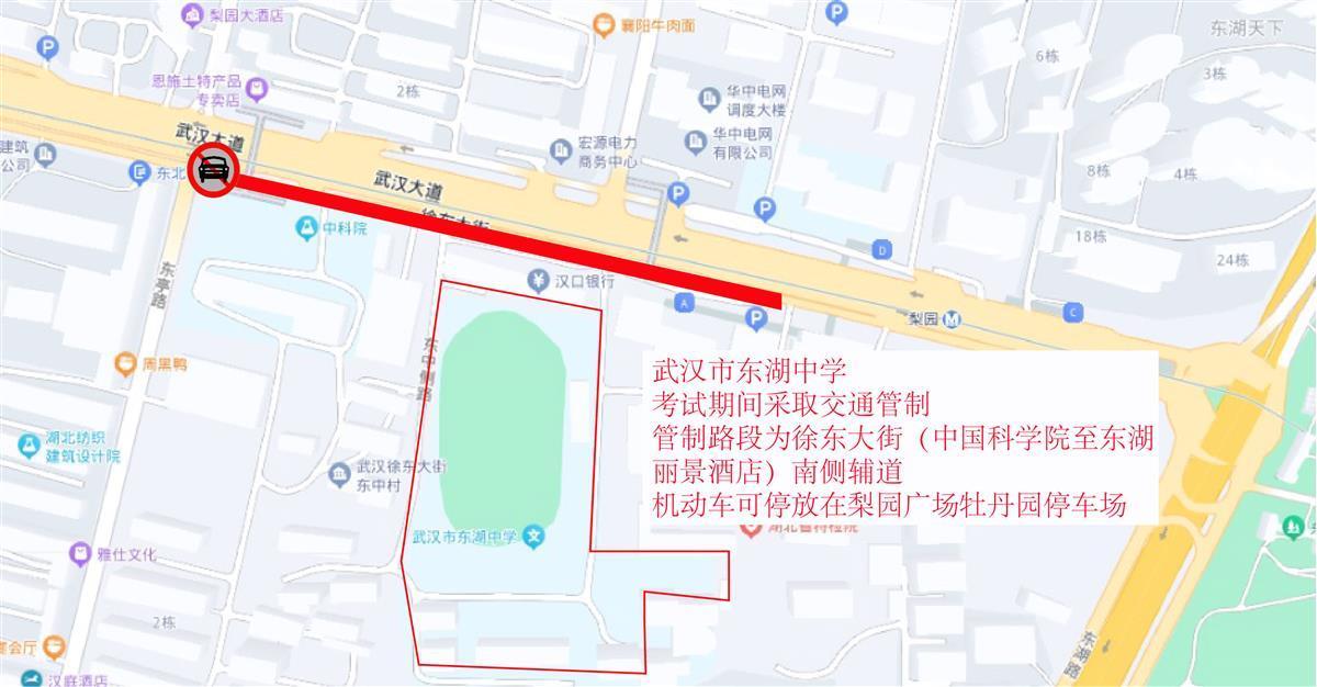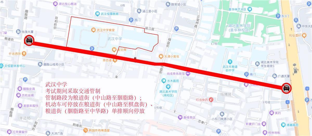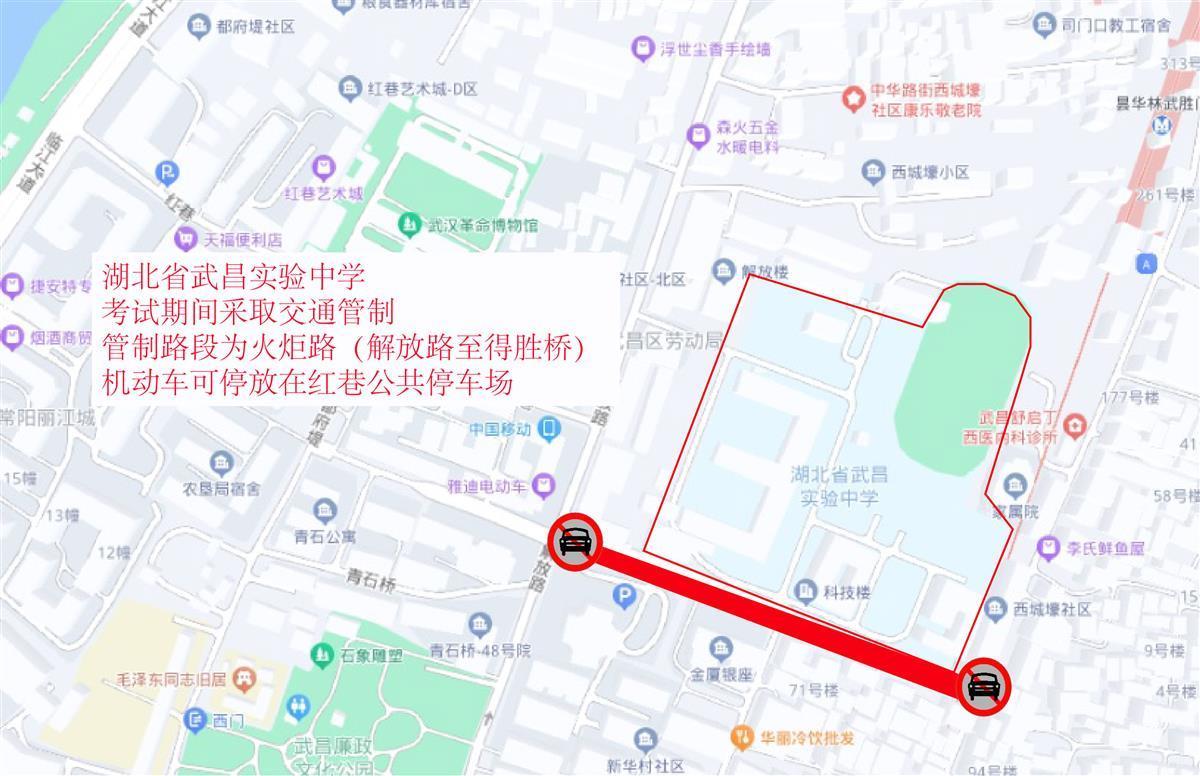 6月5日,武昌交警发布高考考点交通图。高考期间,交通管制时间为6月7日-9日,每日上午考试前2小时至当日考试结束。