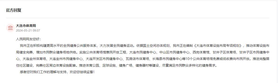 针对该网友的留言,大连市体育局在回复中表示,大连市正在积极构建更高水平的全民健身公共服务体系,大力发展全民健身运动。依据国土空间总体规划,大连市正在编制《大连市体育设施布局专项规划》,推动体育设施布局健全完善,增加市民群众健身场地供给。