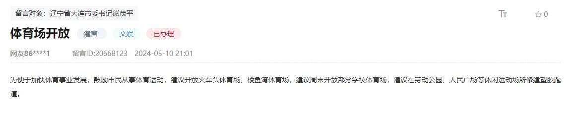“开放大连火车头体育场、梭鱼湾体育场,建议周末开放部分学校体育场,建议在劳动公园、人民广场等休闲运动场所修建塑胶跑道。”网友在留言中写道。