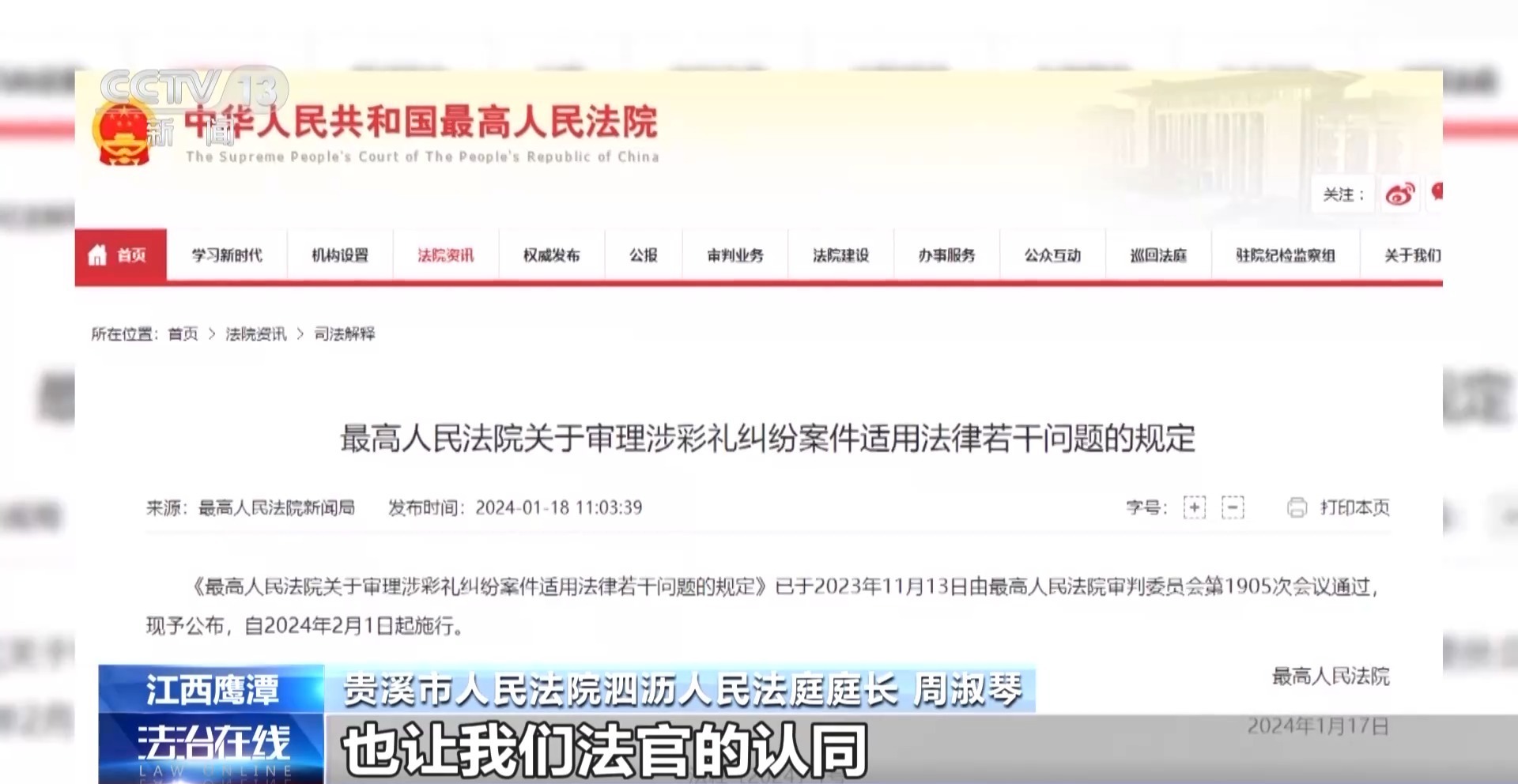 贵溪市人民法院泗沥人民法庭庭长 周淑琴:整个司法解释内容对于彩礼的认定,对于符合彩礼返还的情形,有了更加详细的解释。也让我们基层法官在审理此类案件中有了更多的指引和方向。也让我们法官的认同,与普通民众的朴素价值观找到了一个更好的契合点。